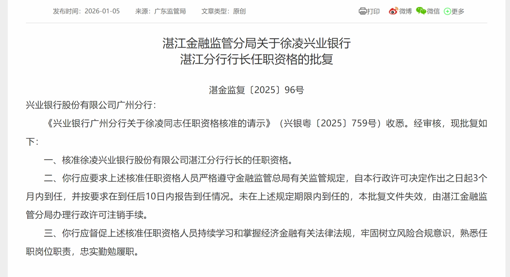 1月5日股票配资助手网,湛江金融监管分局发布关于徐凌兴业银行湛江分行行长任职资格的批复,核准徐凌兴业银行股份有限公司湛江分行行长的任职资格。
